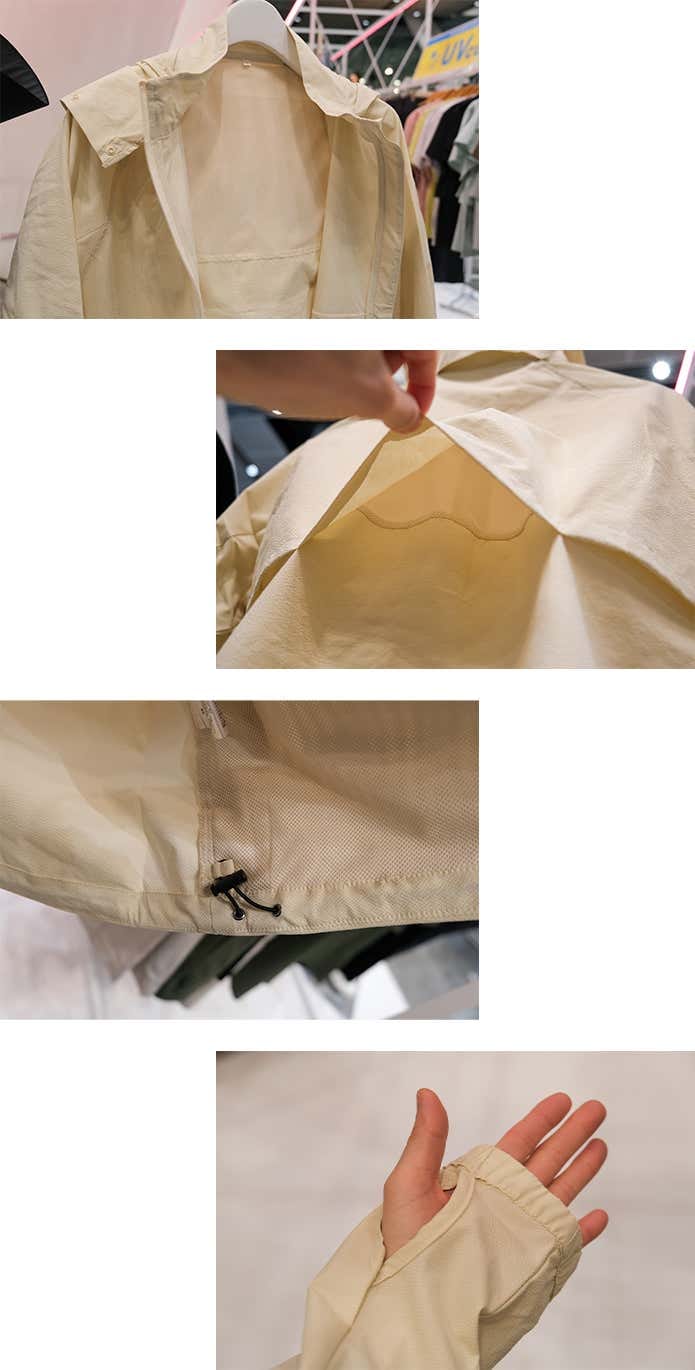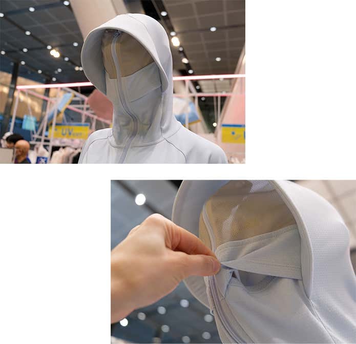 首元にもドットショット加工が施されているのですが、実はこのフーディー……ジップを完全に閉めて、紫外線から顔までしっかりガードすることもできるんです。