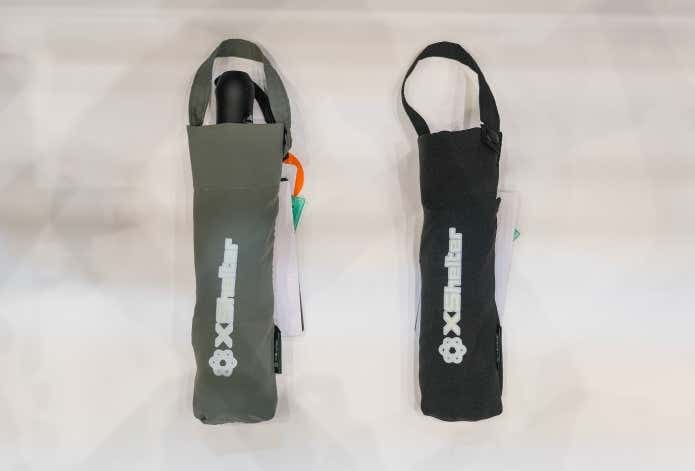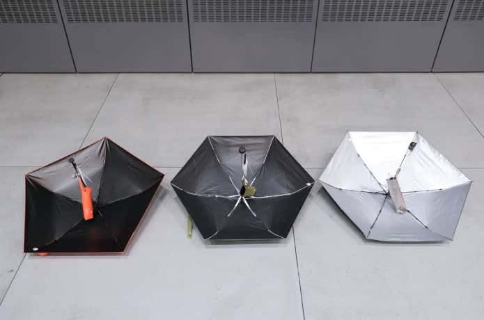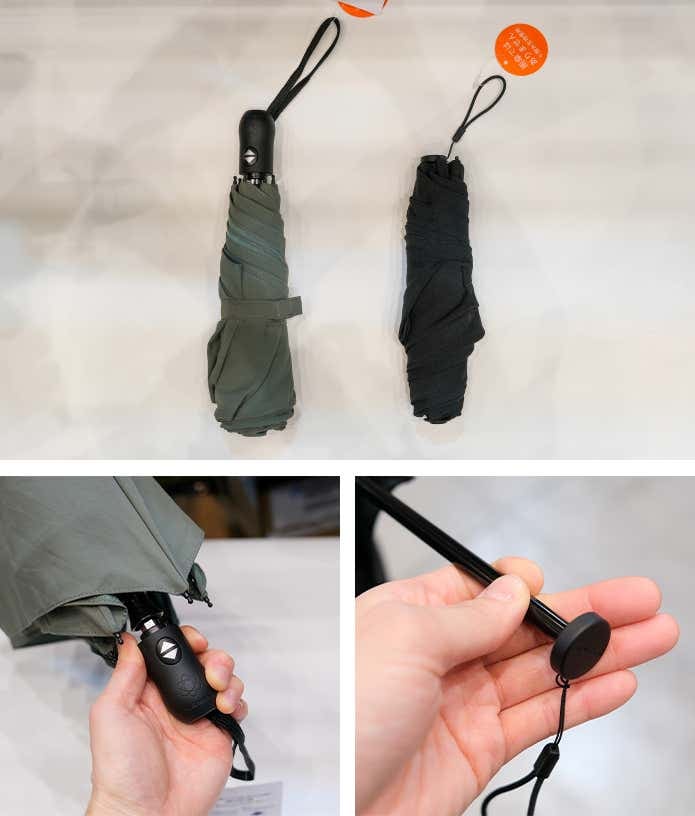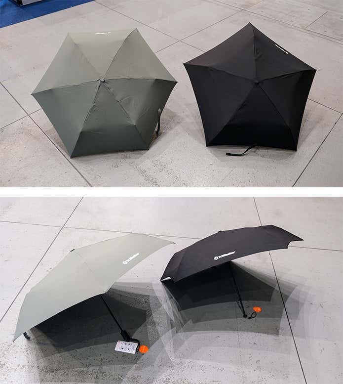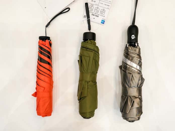 - (左)スリムに携帯できて約140gと軽量な「遮熱スリムアンブレラ」