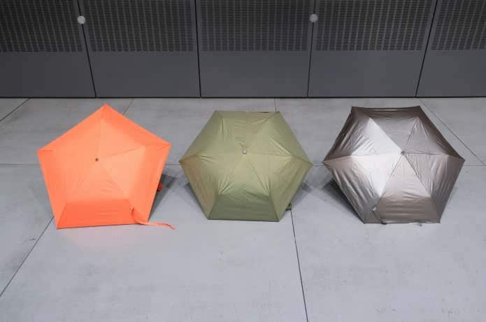「遮熱スリムアンブレラ(左)」のみ5本骨で、ほか2つは6本骨。親骨の長さは、「デイリーアンカーアンブレラ(中央)」のみ49cmで、ほか2つは50cmです。