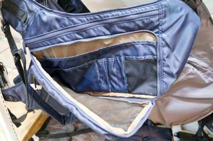 フロントはスナップボタン付きフラップと逆開ファスナー仕様で、上下どちらからでも開閉可能。さらにアンダーフラップ付きで雨の侵入を防ぐ設計です。