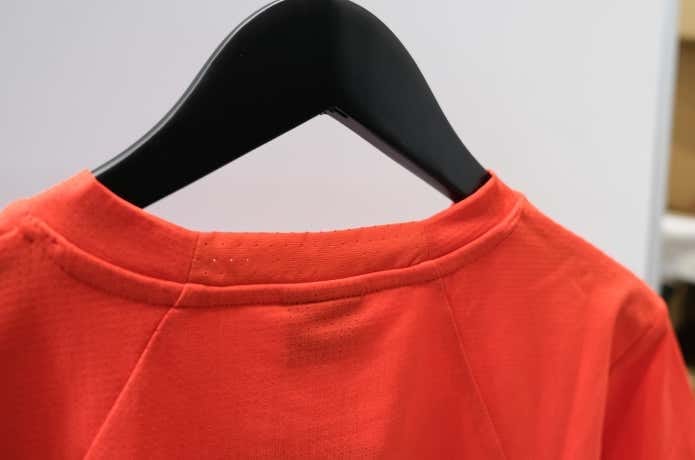 長袖と同様に、蒸れやすい首の後ろと脇下部分は、暑熱αの通気機能「ドットショット」を配し、湿気を効率的に逃すハイブリッド構造です。