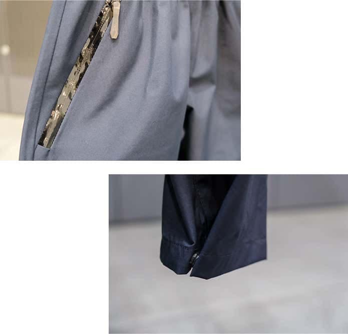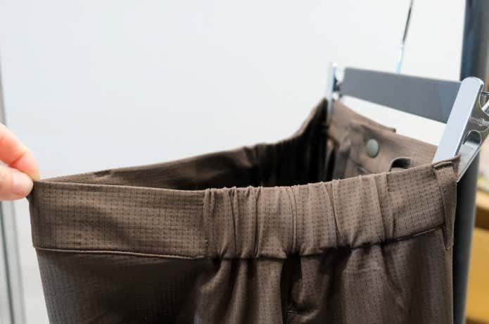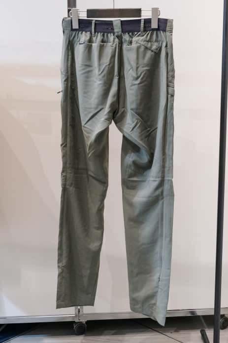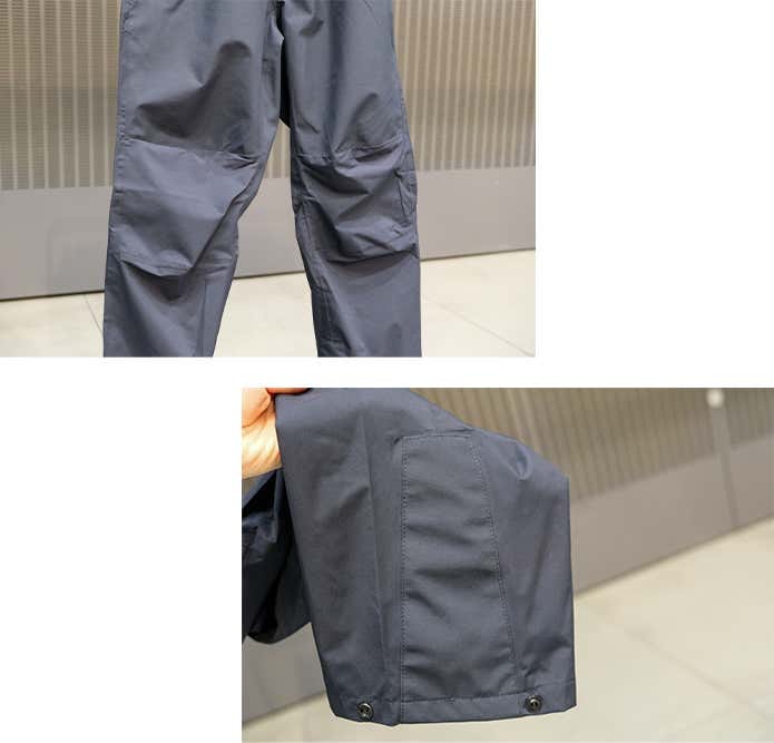 また、フロント左右にはベンチレーションポケットを備え、パンツ内のムレを効率よく放出。足元はボタンで調整可能、ウエストはゴムと内側の紐でフィット感を細かく調整できます。