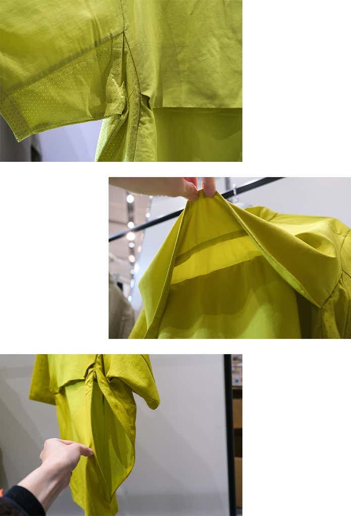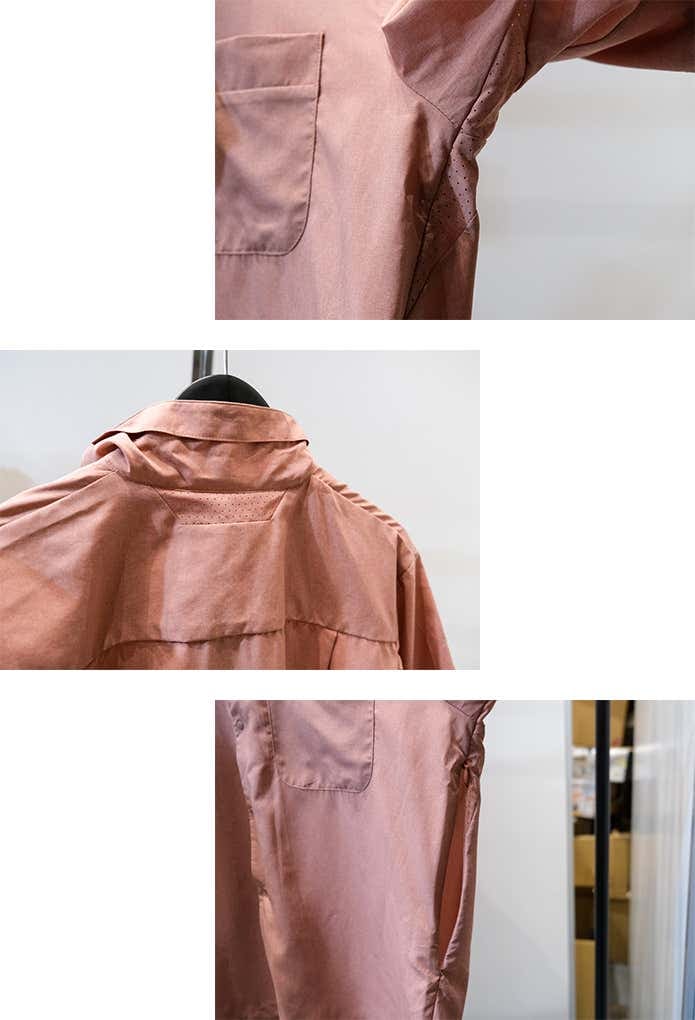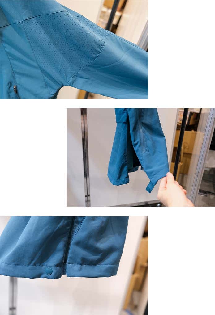 脇部分が通気性を高めるドットショット加工になっているうえに、両サイドにもベンチレーションがあり、脇下まで大きく開くことができるのが好ポイント。内部の蒸れを一気に解放できます。裾にバタつきを防止するボタンが付いているのも便利です。