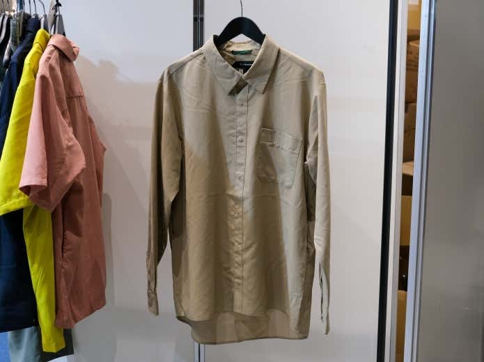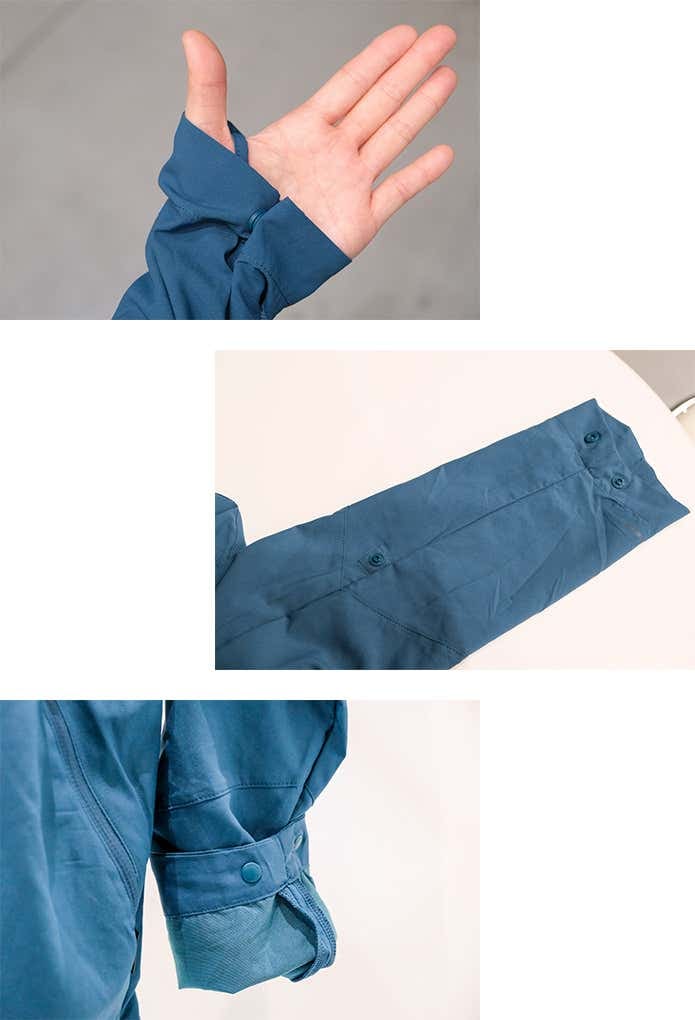スナップボタンで少しだけ袖口を絞れる仕様。長めの袖とサムループで、手の甲まで紫外線からガード。袖を留めるボタン付きで、ロールアップして着こなすこともできます。
