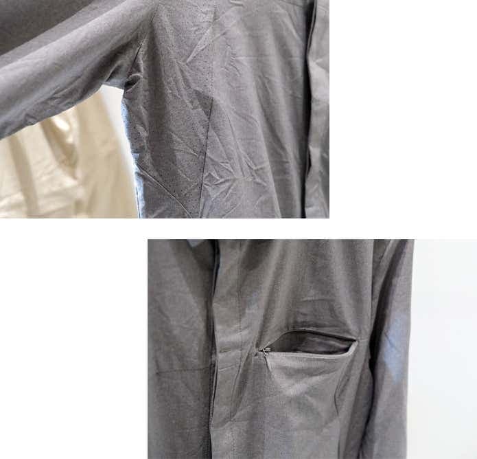 収納面も充実しており、デバイスポケット付きのダブルポケットに加え、左胸には隠しポケットを配置。加えて、反射プリントを各所に配置し、夜間の視認性にも配慮されています。