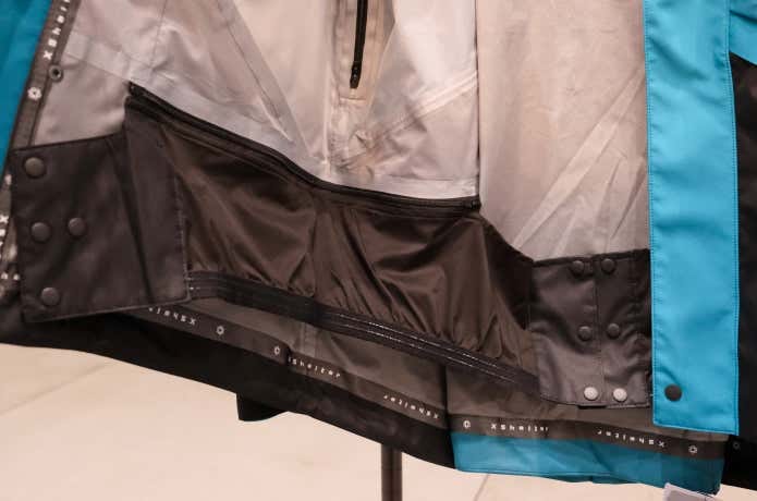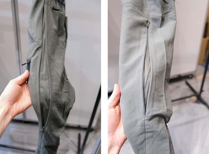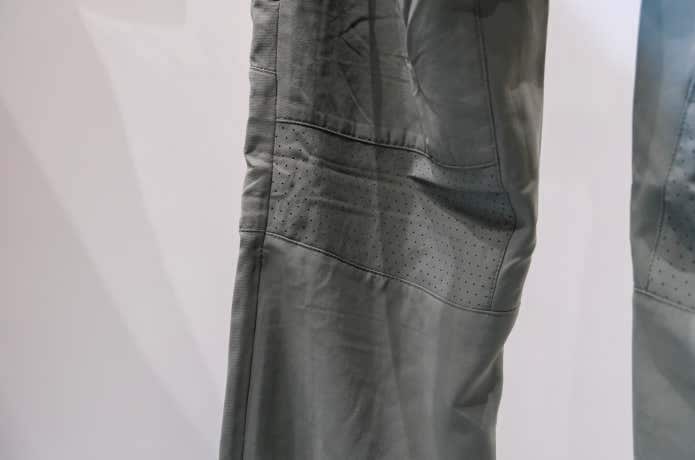 撥水加工が施されているうえに、裾は内側のドローコードで絞ることができ、雨風の侵入を軽減。さらに、膝付近までメッシュ地のインナーパンツが付いており、通気性の良さもポイントです。
