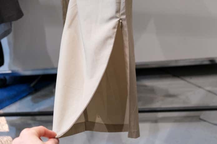 前後差のある裾がデザインポイント。ウエスト内側のドローコードでフィット感の調整も可能。フロントには小物収納に便利なポケットも備えています。