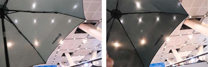 - (右)両面のチタンコーティングにより驚異の遮熱“マイナス15℃”(※)を実現した「両面チタン遮熱アンブレラ」