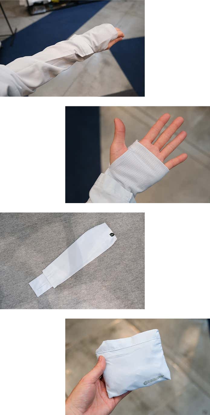 ストレッチ性のない暑熱αに対し、暑熱βはこんなに伸縮します。袖口にはサムホールが付いており、手の甲まで日差しをガード。