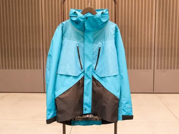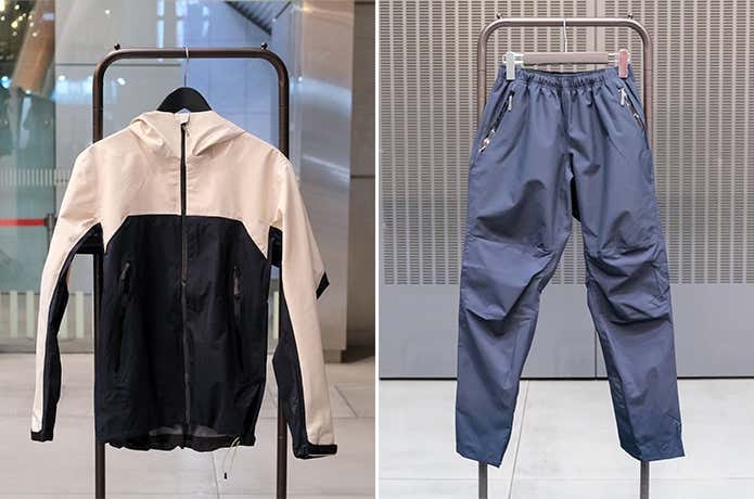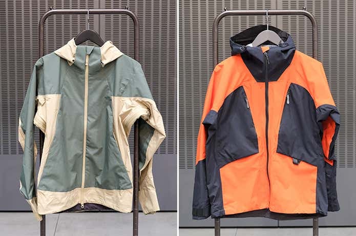 登山仕様のトレックモデル(左)と釣り仕様のオーシャンモデル(右)が用意されたレインジャケットは、昨年から継続。