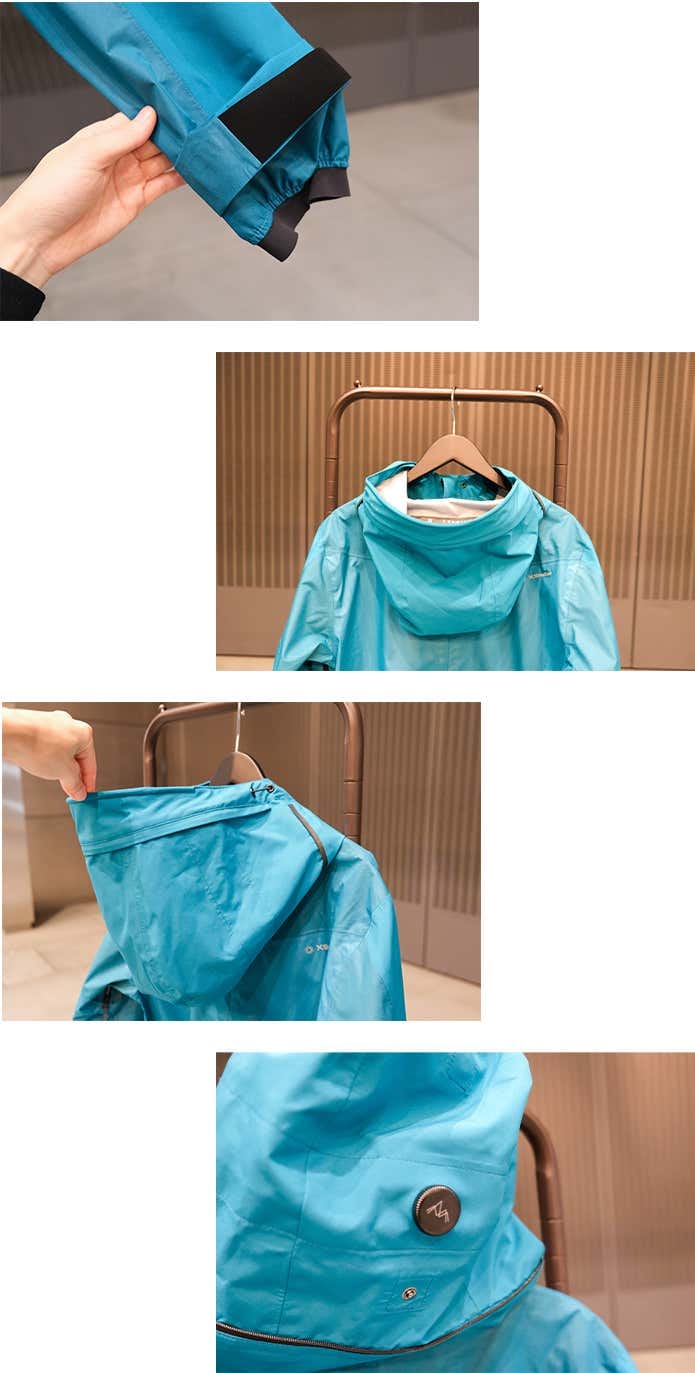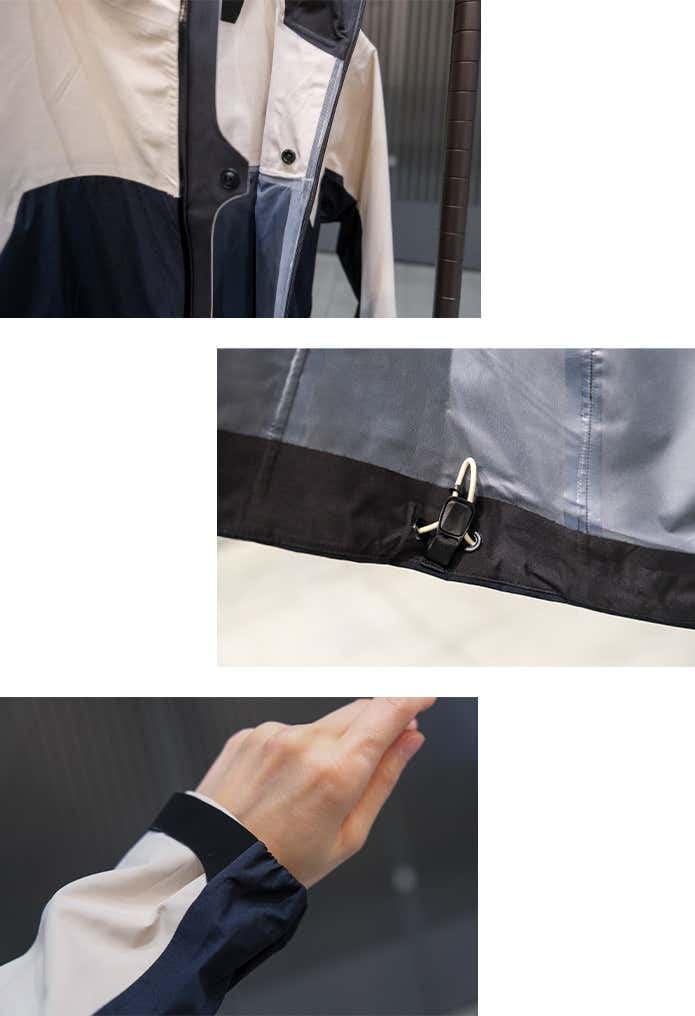 袖口は面ファスナーでフィット感を調整でき、インナースリーブが雨の侵入をガード。フードはスタンドカラーとしても使える2WAY仕様で、ダイヤルによるフィット調整も可能です。