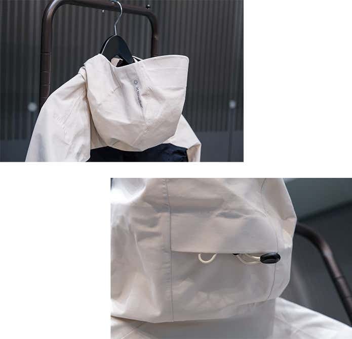 フードは収納できるパッカブル仕様。立体的な形状でかぶり心地がよく、アジャスターでフィット感の調整も可能です。