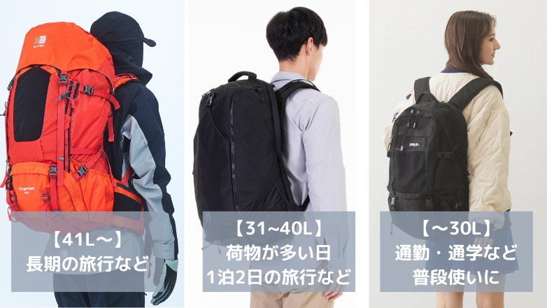 ①容量:普段使いや1泊程度は30L前後、旅行は41L〜を目安に