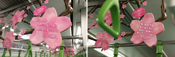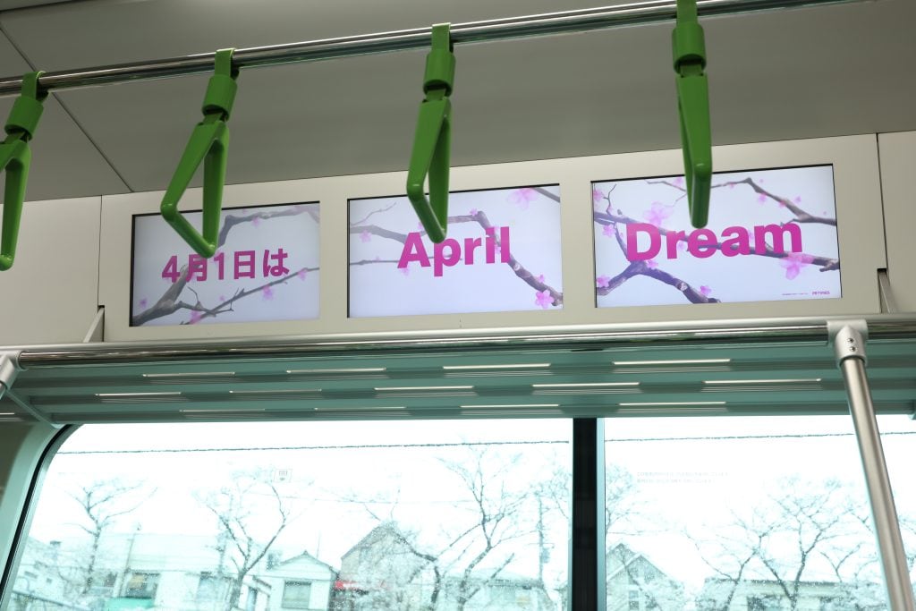 個人と企業・団体の夢は、中吊り(フィルムくり抜き加工)とドア横のポスター、そしてデジタルサイネージに掲示する。伸びた枝に桜の花が大きく咲き、一つ一つの花にそれぞれの夢が書かれたデザイン。中吊りは枝の隙間を全てくり抜いて展示するため、幾重にも重なる桜のカーテンの向こうまで見渡すことができる。
