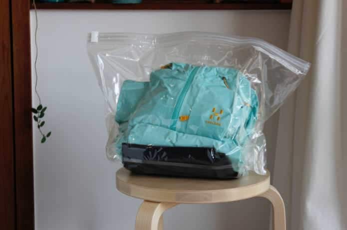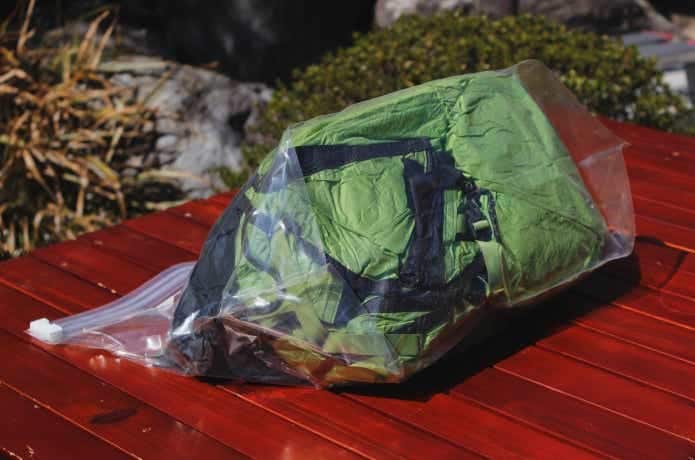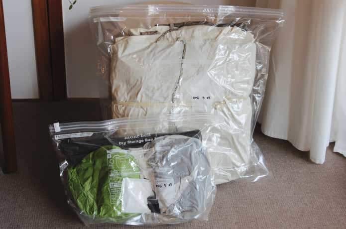 バックパックはどうでしょうか? 本格的なモデルにはシームテープやPUコーティングが採用されていることも多く、これらは加水分解による劣化が起きやすい部分なので、ドライストレージバッグでの保管にももってこい。