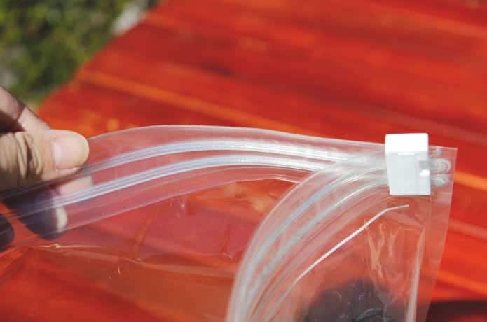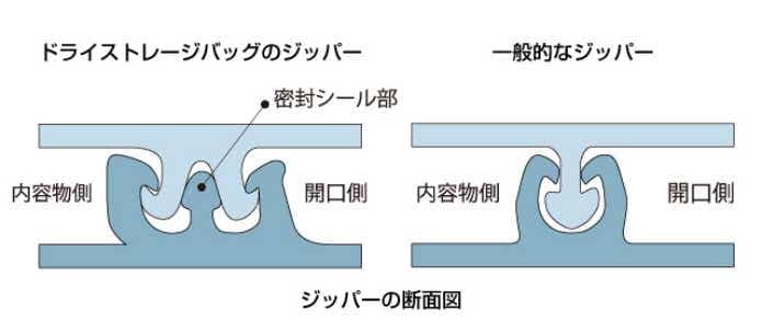 ジッパーは二重構造で、しっかり密閉できる仕様。一般的なものと比べて、水蒸気の通りにくさは3分の1以下とされていて、湿気が入りにくい特長があるそう。