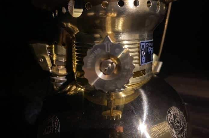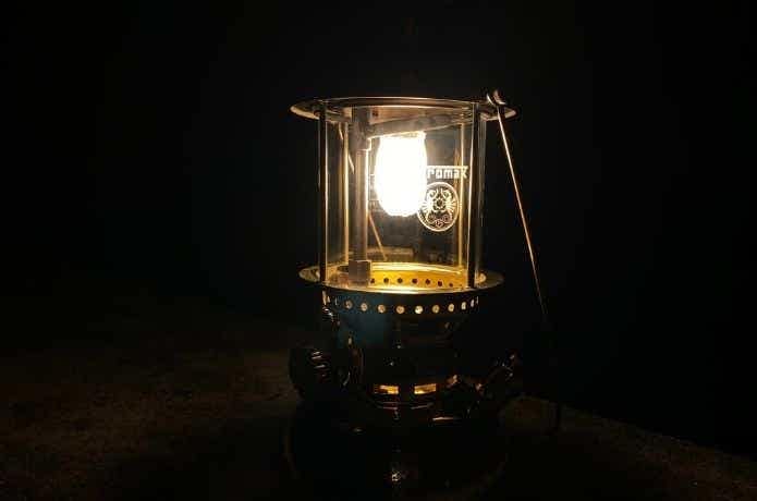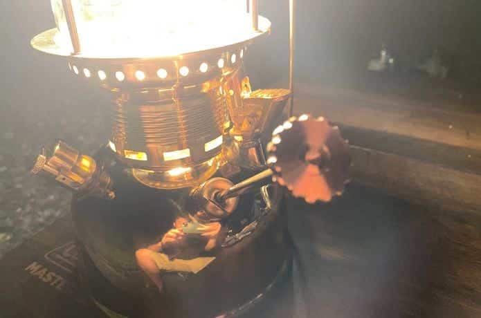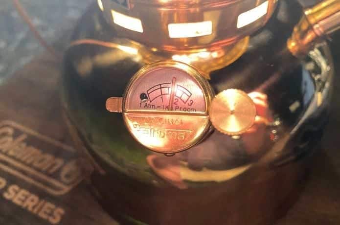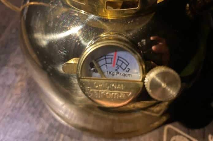 目安は赤いメモリまで。これで点灯完了です。点けたあとも圧力を維持しないと明かりが安定しなくなり暗くなってくるので、1時間に1回ほど圧力をチェックして、下がっている場合は赤いメモリまでポンピングするようにしましょう。
