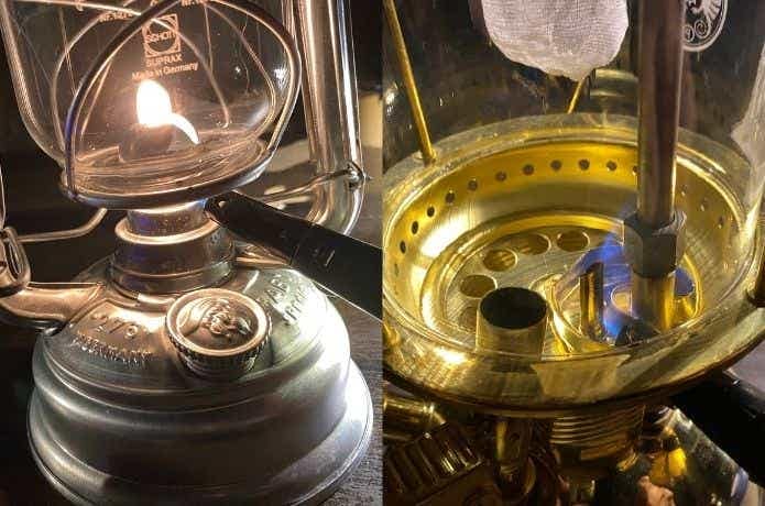 オイルランタンは、主に芯を用いて燃料を吸い上げる仕組みの「非加圧式」と、タンクに空気圧をかけて、燃料を送り出す仕組みの「加圧式」の2種類があります。