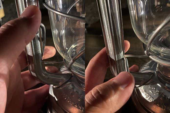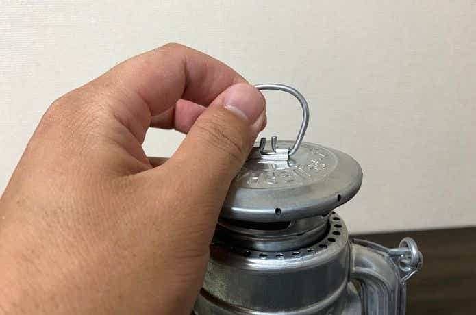 オイルランタンを使ううえで煤掃除は必須! 煤がホヤに溜まると黒くなってしまい、せっかくのランタンが暗くなってしまいます。手順はいたって簡単で、はじめにランタンの上部を引っ張りホヤを倒します。