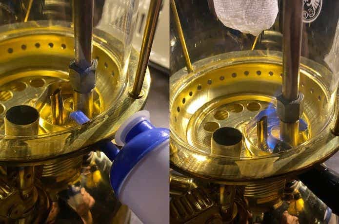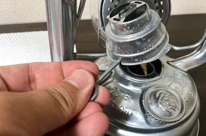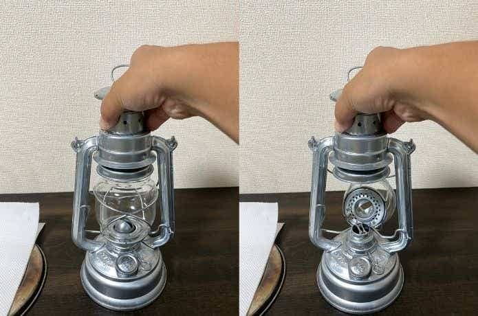 芯の交換が終わったら、ランタンの上部を引っ張りながらホヤを下に戻して芯交換完了です。なお、芯を交換したあとに初めて使用する際は、燃料を入れてから30分ほど時間を置いて、芯にしっかりと燃料を染み込ませてから点けるようにしましょう。