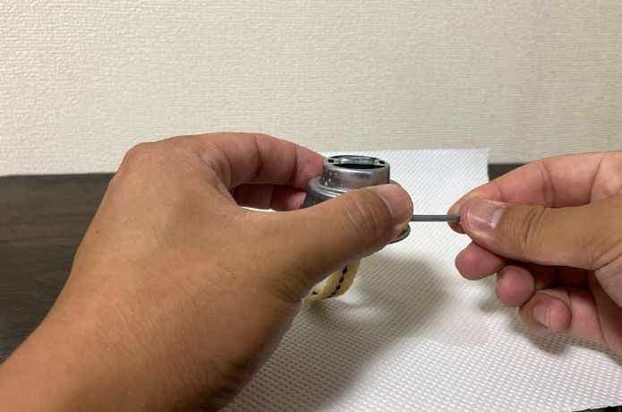 ツマミをそのまま引き上げると、芯も一緒に取り外すことができます。芯はオイルを吸っているためテーブルにそのまま置かず、キッチンペーパーなどの上に置くようにしましょう。