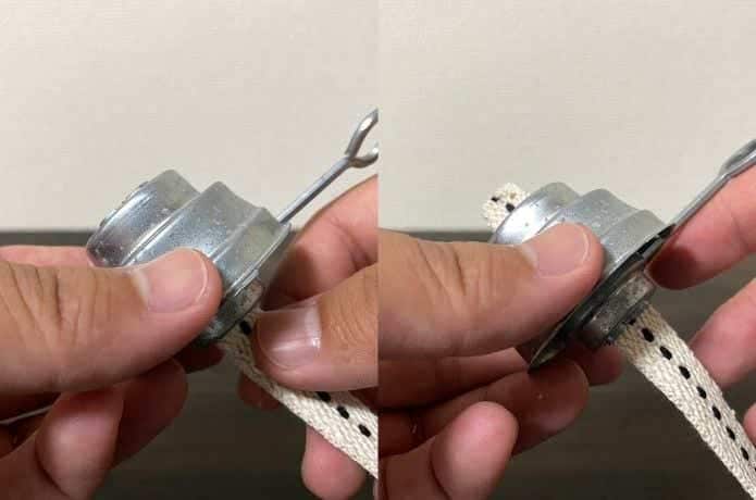 芯を取りつける前に、先端を台形にカットします。そのままでも使うことができますが、カットしたほうが芯をバーナーに入れやすく、点灯したあとの炎の形もきれいになります。