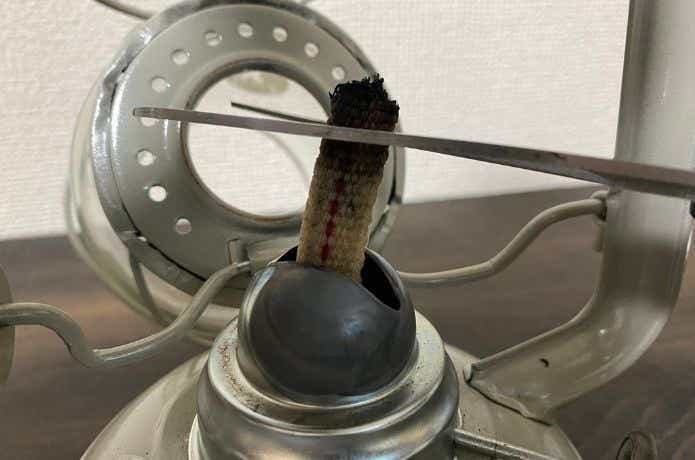 芯の焦げた部分が多くなると、炎が丸くなり明るさが弱くなります。芯がたくさん残っている場合は、黒くなった部分を切ってあげると明るさが復活します。