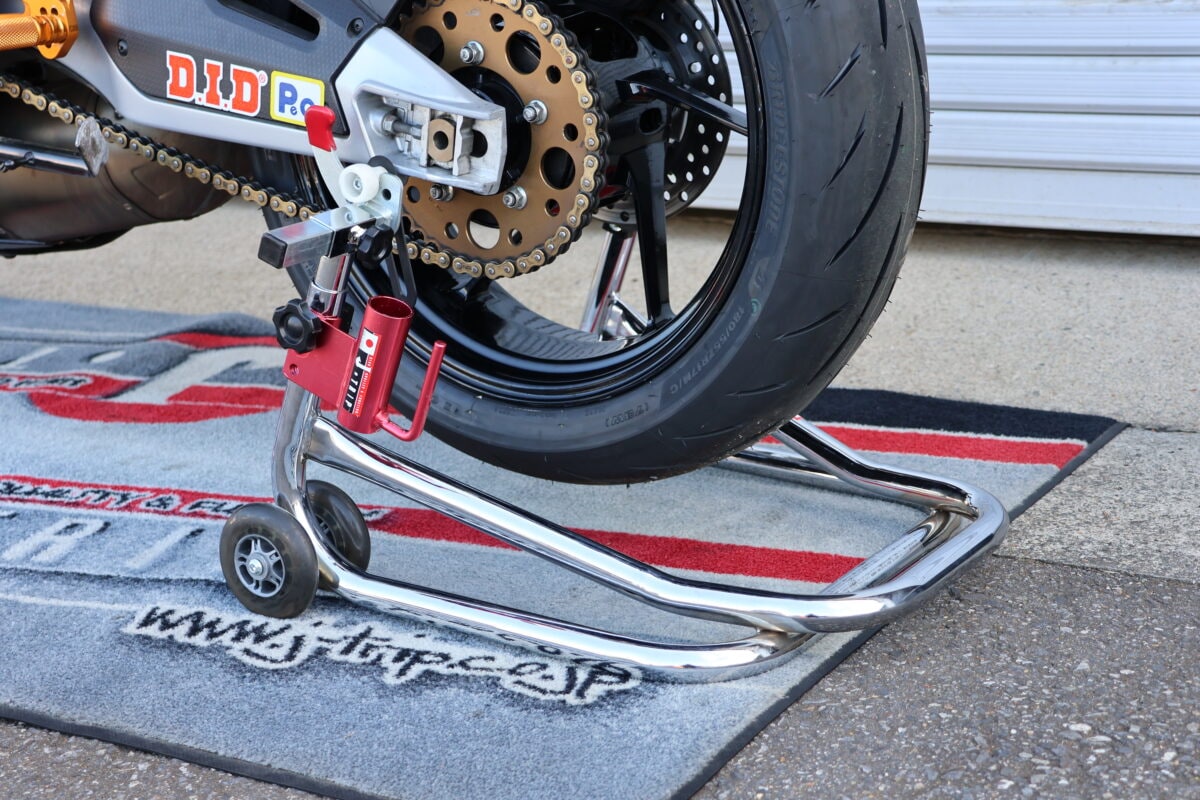 ①まずはリヤスタンドをしっかりとかける。これによってフロントを持ち上げることができるからだ。こちらはJ-TRIPがリリースしている初心者でも安心して使える「はじめてスタンド」。