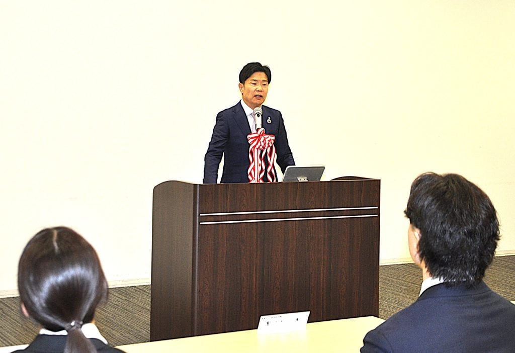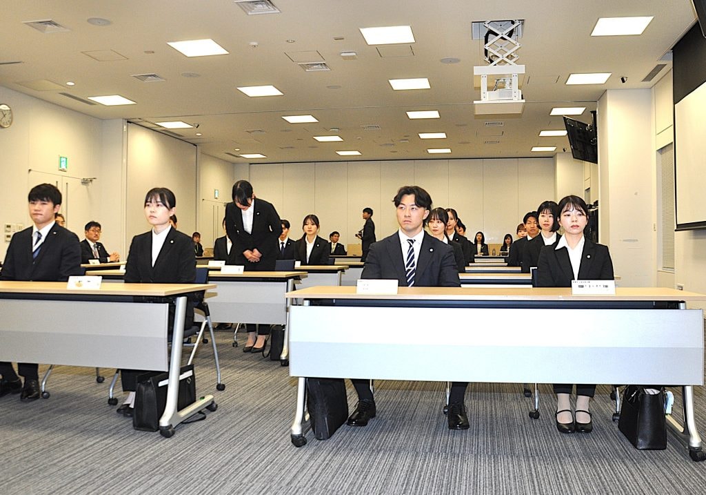 紺色のスーツに身を包み真新しい徽章を襟に着けた新入社員は一足早く式会場入り、全員緊張した面持ちで、内田高広社長ら9人の役員・幹部を迎えた。