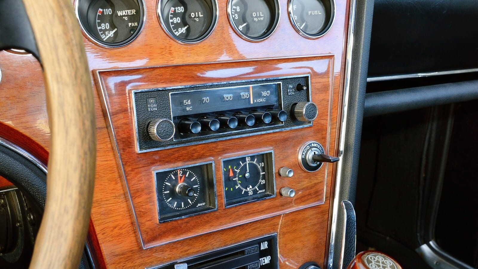 当時の装備としては、電動アンテナのスイッチが付いたプッシュボタン式のAMラジオがあった。ハンドブレーキは傘の柄のようなステッキ型をしている。ダッシュボードの中央には、アンメーター(電流計)、水温計、油温計、油圧計、燃料計という、クロームリングで縁取られた5つのメーターが一直線に並んでいる。さらに2つの時計があり、そのうちの1つは高度計スタイルのストップウォッチだった。