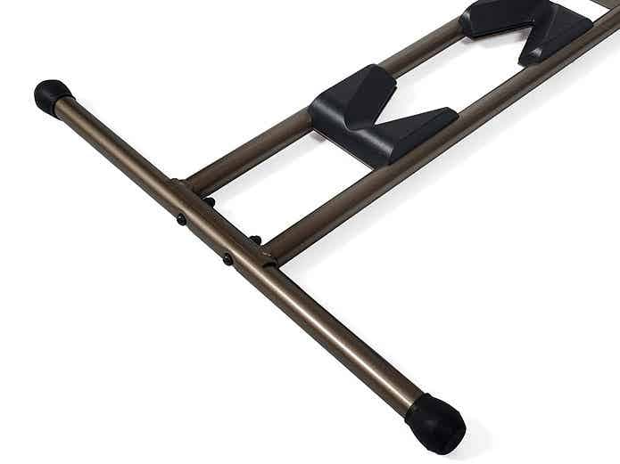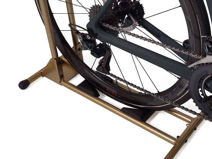 設計面では、室内での使用を前提にした工夫が随所に見られます。リムと接触する部分にはPEコートを施しており、バイクへの傷を防ぐ仕様。床と接する部分はゴム素材を使用しているため、フローリングなどを傷つけません。