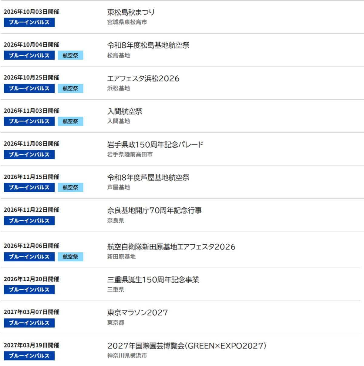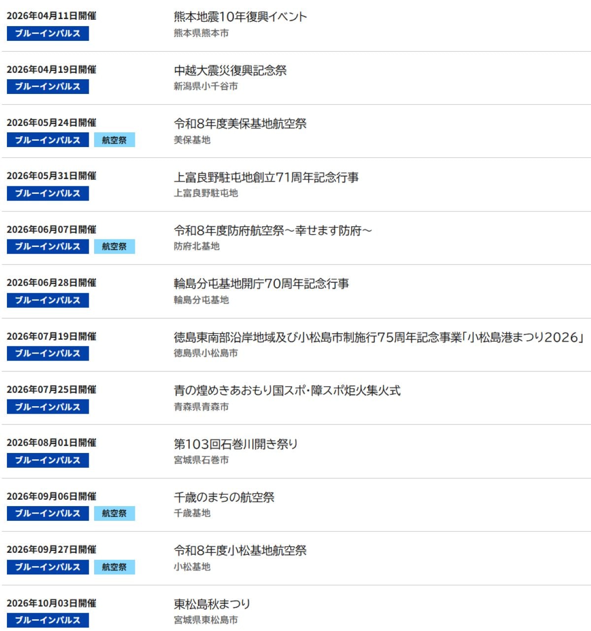 ブルーインパルス展示飛行 2026年度の開催一覧
