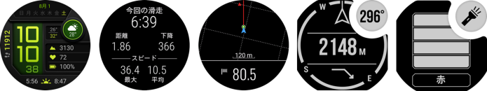 90種類以上のスポーツ機能やトレーニング機能を搭載。ABCセンサー(高度計・気圧計・電子コンパス)による精密なナビゲーション、往路復路ナビゲーション、事故検出やSOS信号送信機能も備え、安全面も考慮されています。