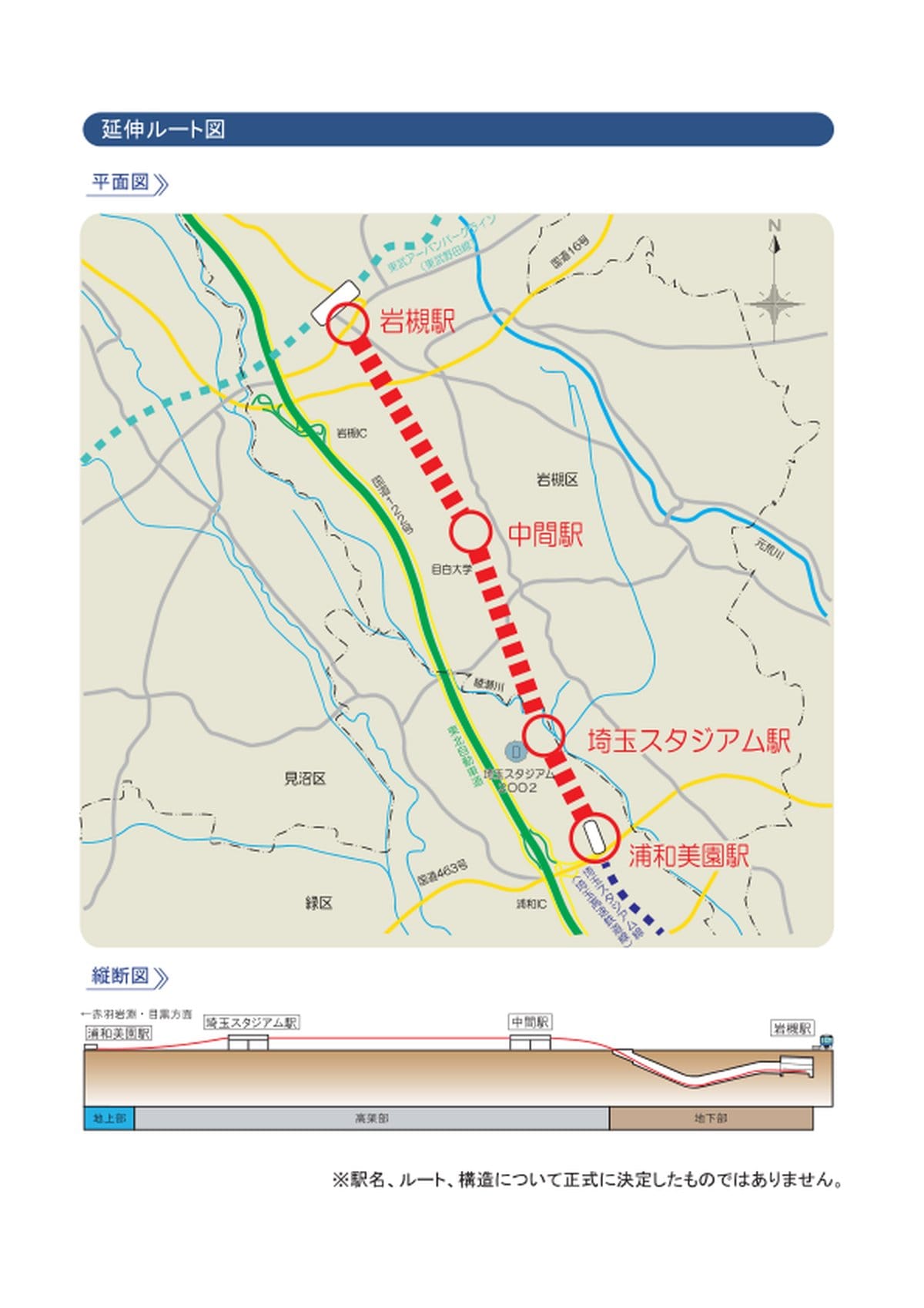 ・整備駅:浦和美園駅※既存駅、 埼玉スタジアム駅(仮称)※臨時駅、中間駅(仮称)、岩槻駅(仮称)