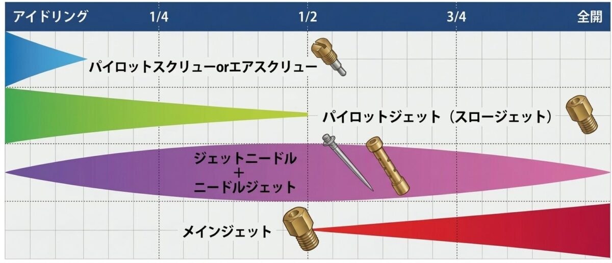 アクセル開度(全閉、1/4、1/2、3/4、全開)によって各パーツが担う領域が異なります。まずはこれを理解しましょう。