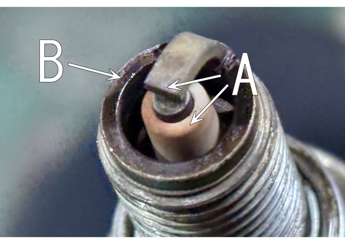 実走したあとはスパークプラグを取り外して焼け色をチェック。チェックする場所は以下の図でAとBです。