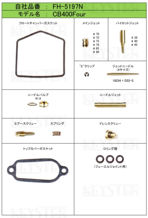 このようにマニュアルの数値から外れる個体の場合、キャブをセッティングして燃調を濃く/薄くする必要があります。しかしメインジェットは♯75のほか、♯78や、状況によっては♯82、♯72も用意しなければいけません。こんなときに役立つのがキースター燃調キットです。