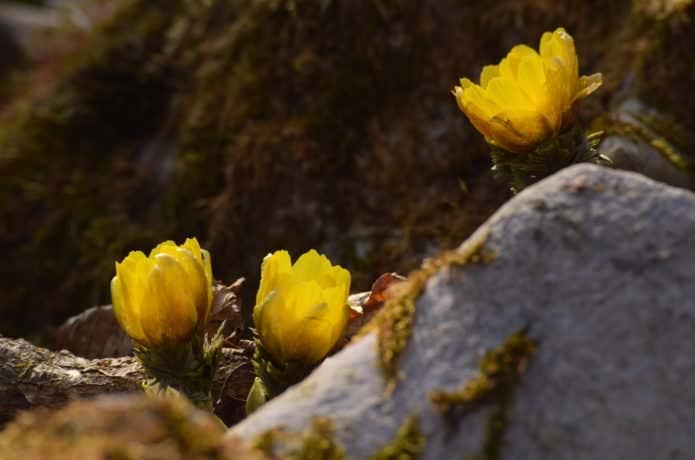 春の藤原岳のシンボルと言われるのが「フクジュソウ」。そのほかにも、セツブンソウ・キクザキイチゲ・アズマイチゲ・ヒロハノアマナなど多くの貴重な山野草が楽しめます。
