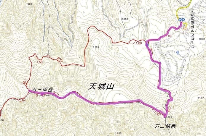 天城縦走路入口(15分)→四辻・万二郎岳登山口(40分)→万二郎岳(50分)→万三郎岳