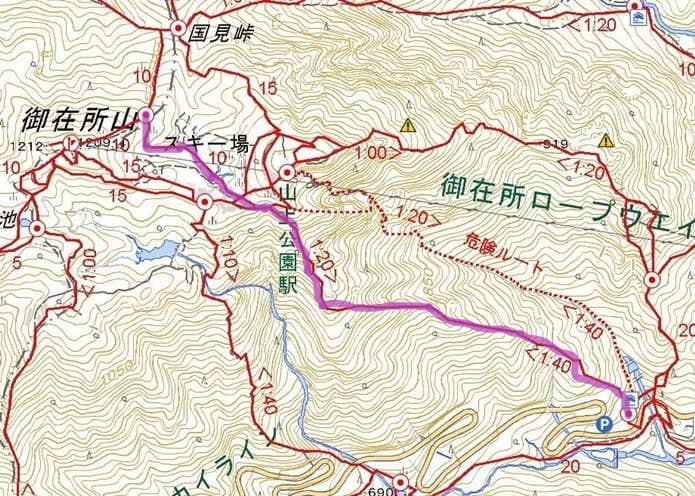 一ノ谷御在所山の家→(120分)→山上公園→(15分)→御在所岳(10分)→山上公園(90分)→一ノ谷御在所山の家