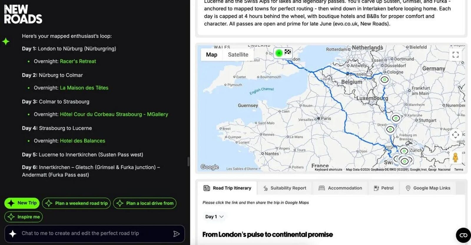 まず、我々の要望を説明した。「ロンドンからスイスまで車で往復し、期間は約1週間。1日の運転時間は4時間以内で、道中でいくつかの興味深い都市を訪れ、スイスの有名な峠道をルートに含めること」だ。