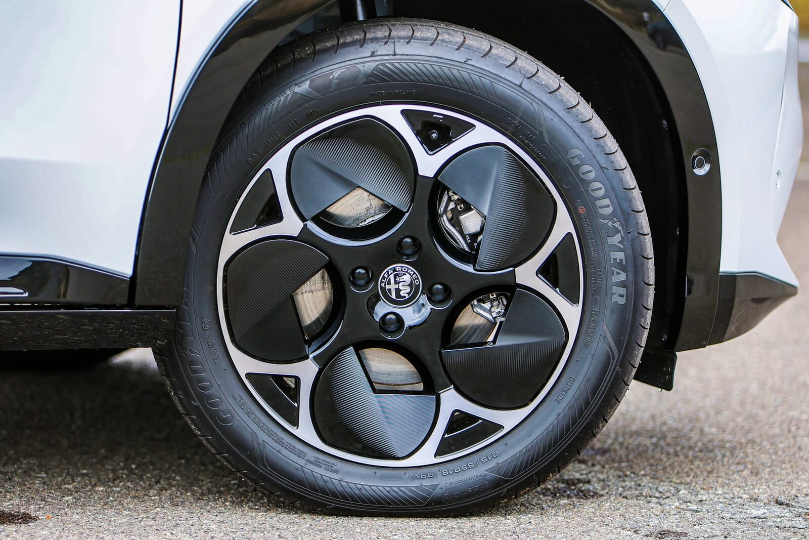 このモデルのハイライトの一つが、足元を引き締める「18インチ エアロ アルミホイール(5つ葉デザイン)」だ。アルファ伝統の梅ホイール(テレフォンダイヤル)を現代的に再解釈したようなデザインだが、これは単なる過去へのノスタルジーではない。