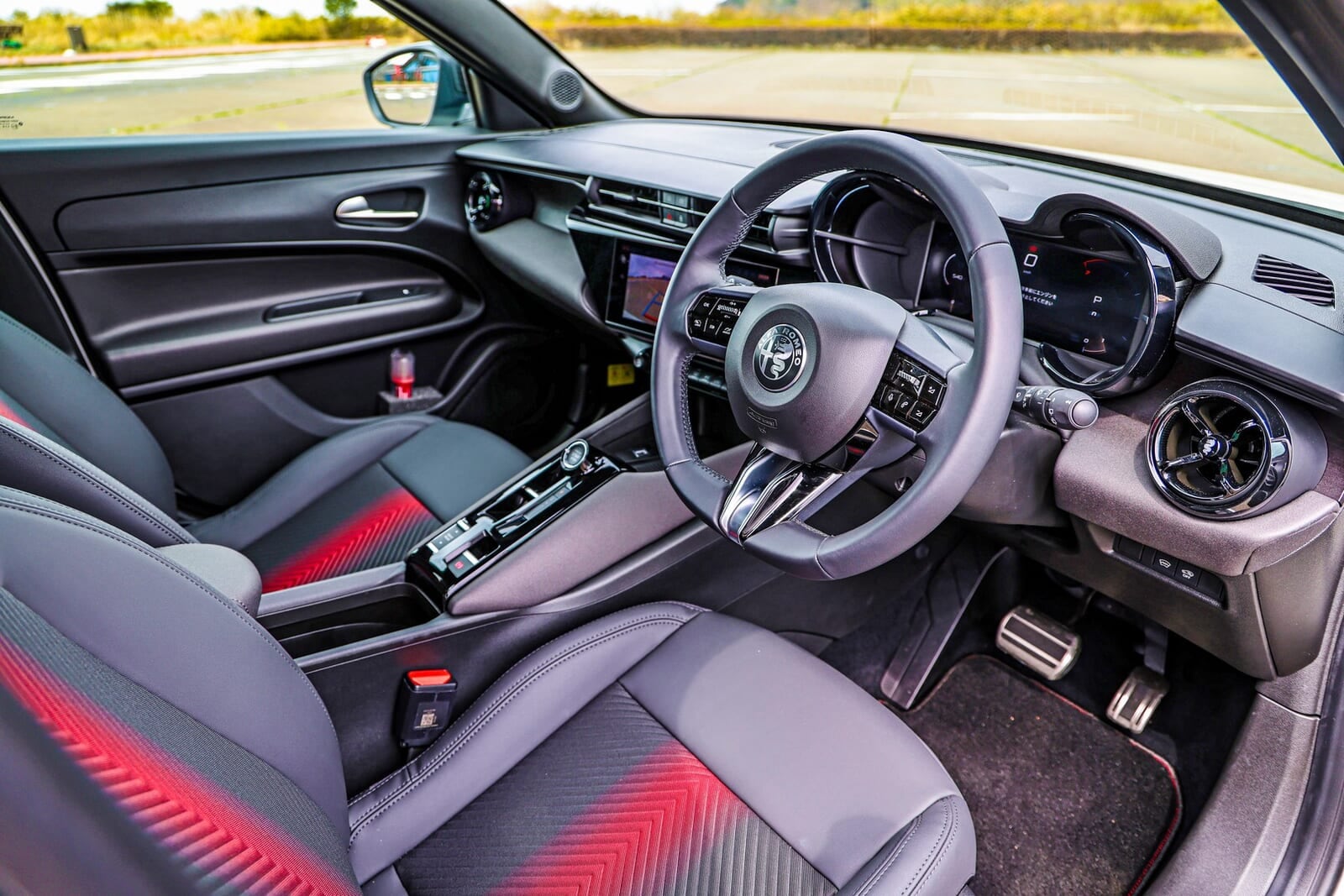 小気味よい音を立てるドアを開け、運転席に滑り込む。インテリアはコンパクトながらも、メーターカウルやステアリングの意匠に、アルファ ロメオらしいドライバー中心のタイトでスポーティな空間が広がっている。