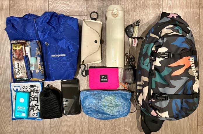 行動食/手拭い/リップ・目薬/薄手のウインドシェル/サングラスケース/水筒(500ml)/鍵/アメ/モバイルバッテリー/スマホ/ポーチ財布/エコバッグ