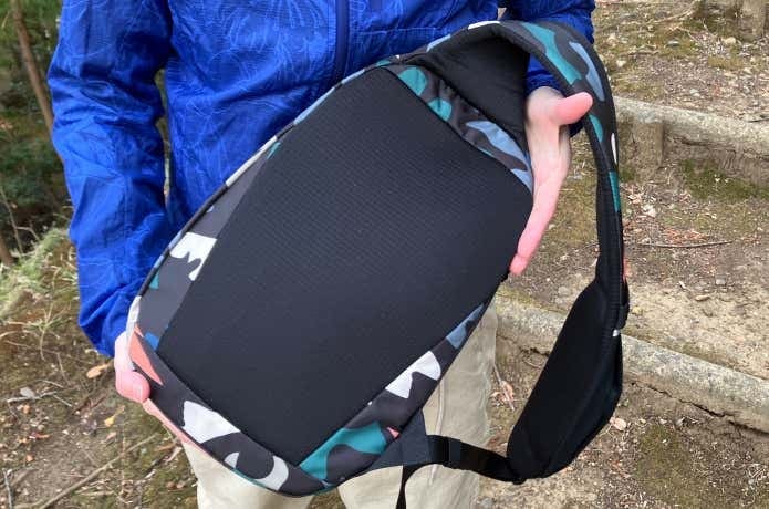 背面には通気性のあるメッシュ素材を採用。適度な厚みのパッド入りバックパネルが体にフィットしつつ、蒸れにくさにも配慮されています