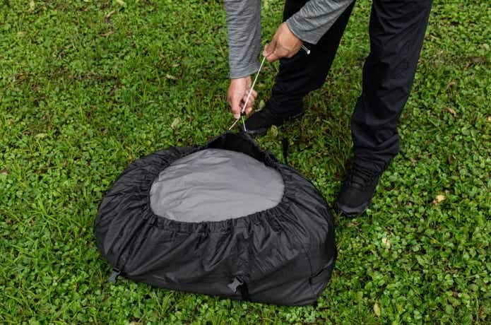 見逃せないのが、巾着式のキャリーバッグ。テントは、取り出したときのように小さくたたむのが意外と難しいものです。