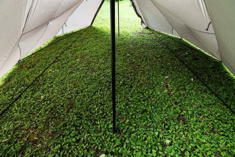 ビルディングテープ付きの4コーナーをペグダウンし、ポール2本を差し込むだけで自立するので、手順も分かりやすく、スムーズに設営できます。
