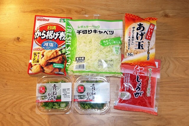 (2)具材! (1)に具材を入れる。メインはキャベツだが、コンビニで売っている千切りキャベツのパックを使うと便利。そのほか青ネギたっぷりと、細かく刻んだ紅しょうが、揚げ玉を入れよう