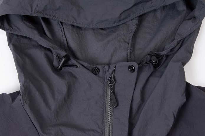 胸元はスナップボタン付き。フードはアジャスタコードで調整可能で、アクティブなシーンにもストレスがない着用感です。