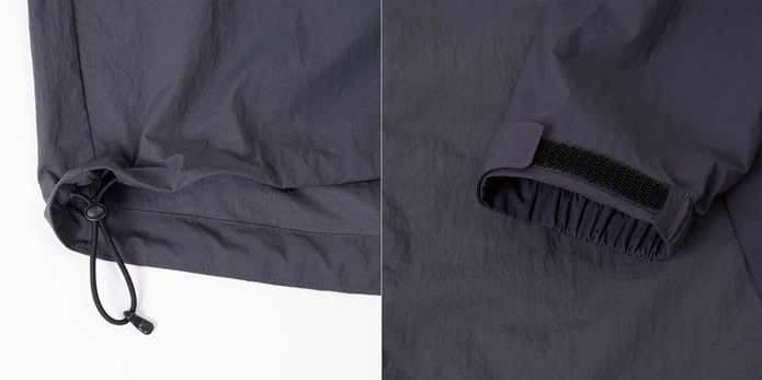 裾はドローコードで絞ることができ、袖口はタブ付きのベルクロ仕様。風の侵入を防止し、しっかりと防寒します。
